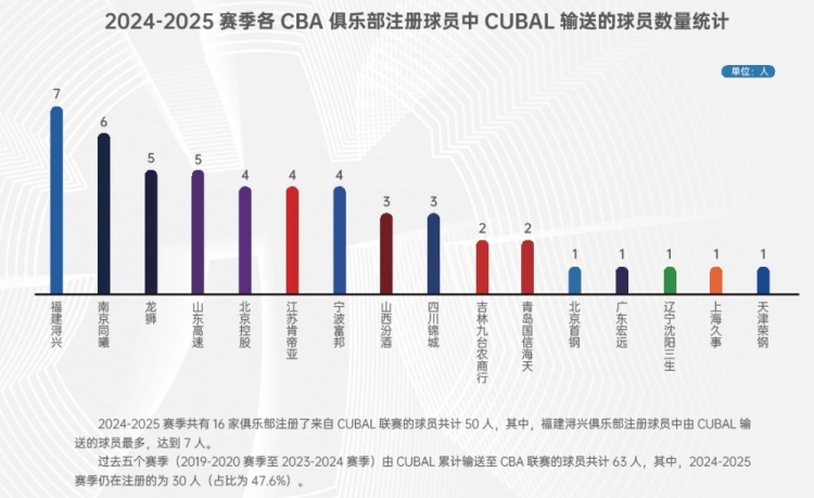 其中,本賽季各俱樂部中CUBAL輸送球員的統(tǒng)計情況如下。福建有7人最多、同曦6人第二,廣州和山東各5人。