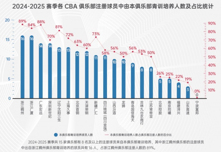其中,浙江的注冊球員中自家青訓培養(yǎng)的有16人,占比高達89%排第一;