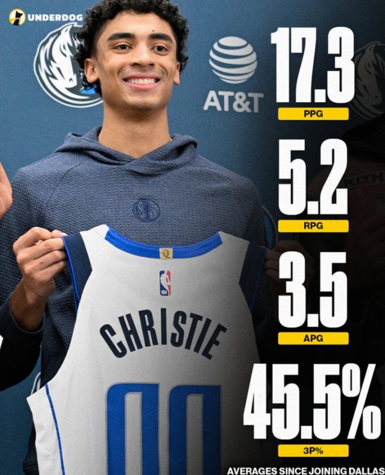 在加盟獨(dú)行俠后,克里斯蒂場均場均拿下17.3分5.2籃板3.5助攻,三分命中率45.5%。