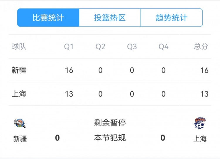 第一節(jié),雙方力拼防守,得分都很困難,新疆全隊23投6中,三分11中2,罰球2中2單節(jié)拿到16分;