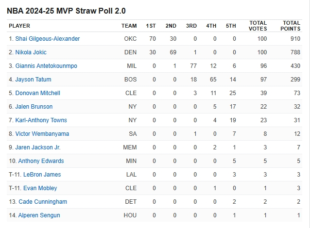 02月15日訊 在全明星間歇期到來之后,ESPN組織了100位記者、媒體人進(jìn)行了賽季第二次MVP模擬投票,亞歷山大獲得了70張第一選票,高居榜首,約基奇拿到了30張第一選票,兩人包攬了所有的第一選票;字母哥票數(shù)總分排名第三,第四是塔圖姆,文班亞馬位居第七,詹姆斯和埃文-莫布里并列第11。