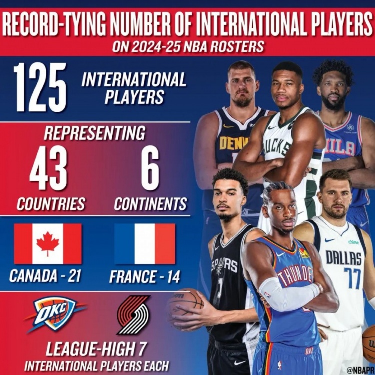 最近幾年趨勢發(fā)生了轉向。2017/18賽季,還有2023/24和2024/25賽季,以NBA揭幕戰(zhàn)的時間點統計,國際球員的數量都達到了歷史最高的125人,占聯盟球員數量的1/4了。