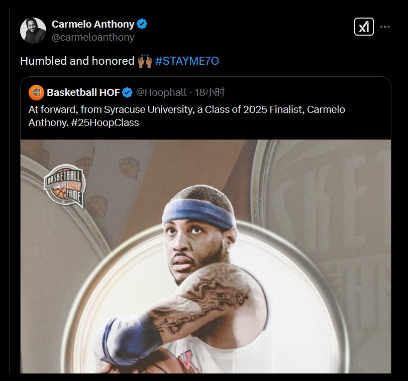 02月16日訊 安東尼更新個(gè)人社交媒體,轉(zhuǎn)發(fā)了自己入選2025年名人堂最終候選名單的新聞。“謙卑且榮幸!????????”安東尼寫道。 標(biāo)簽: 籃球 NBA 安東尼 尼克斯