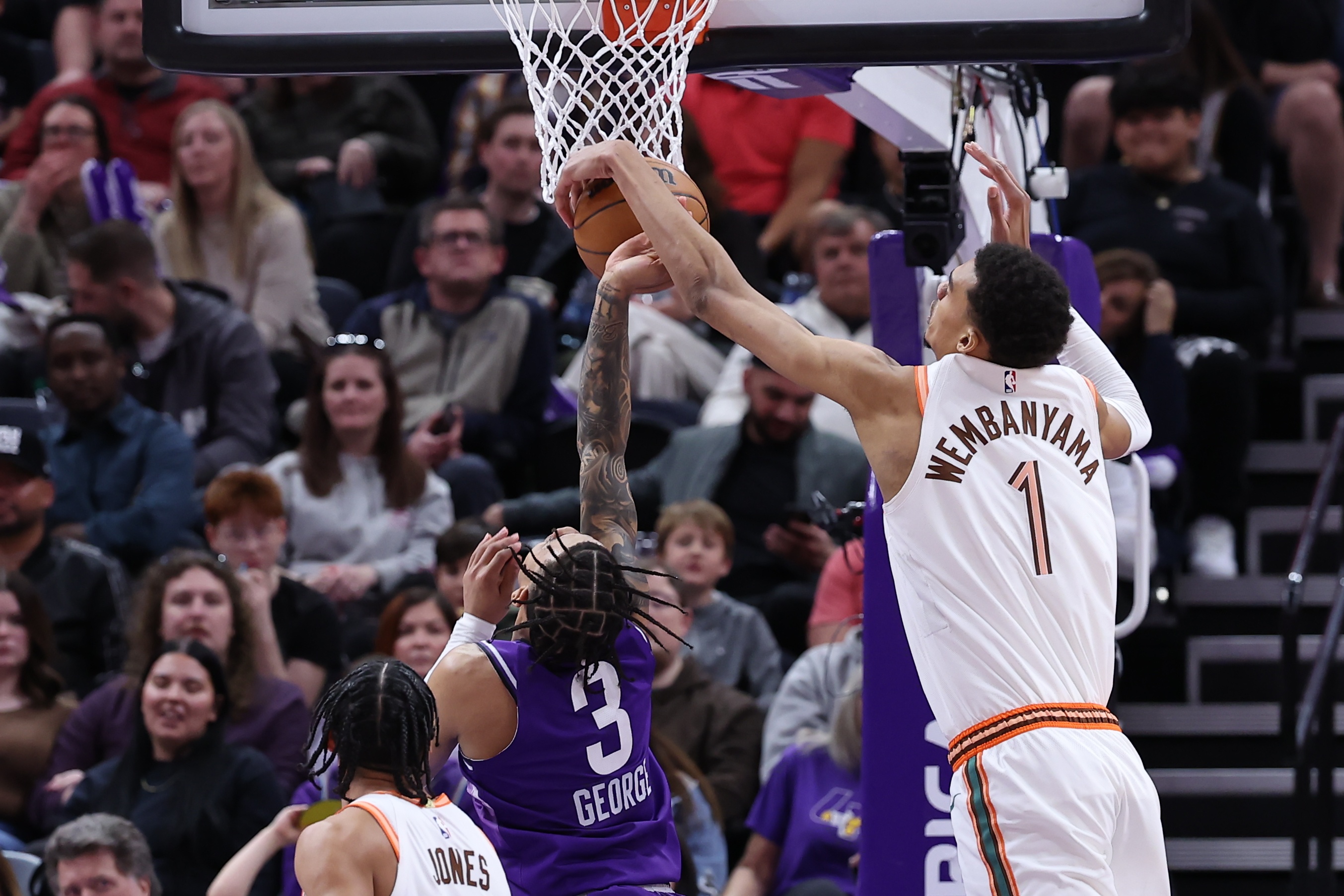至于典型的高個(gè)子球員的任務(wù),文班亞馬擁有8英尺(約合2.4米)的臂展來完成它們。作為一個(gè)天生的籃板手(場(chǎng)均可以得到10.9個(gè)籃板)和籃筐保護(hù)者,文班亞馬會(huì)讓對(duì)方球員猶豫或者完全放棄上籃,或者——因?yàn)樗纳w帽數(shù)遙遙領(lǐng)先聯(lián)盟——面臨著被蓋帽的結(jié)果。