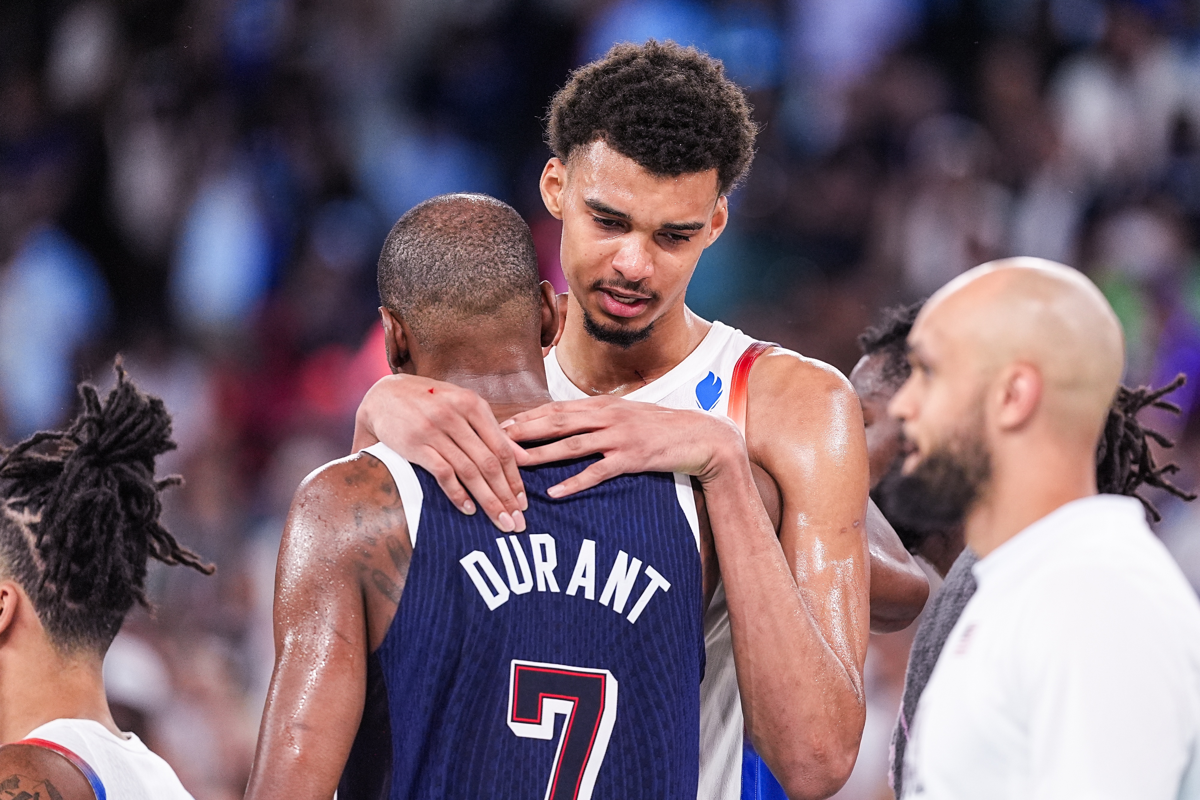 去年夏天,當(dāng)代表法國(guó)男籃的維克托-文班亞馬在其家鄉(xiāng)舉辦的奧運(yùn)會(huì)上距離金牌僅差一場(chǎng)勝利時(shí),他感到很難過……為那些擋在他和他的目標(biāo)之間的對(duì)手感到難過。