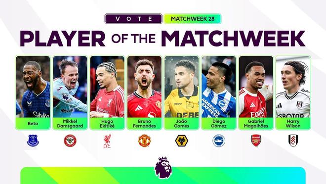 北京時(shí)間3月2日,英超官方公布聯(lián)賽第28輪最佳球員候選名單,這8名球員為貝托、達(dá)姆斯高、埃基蒂克、布魯諾-費(fèi)爾南德斯、若昂-戈麥斯、迭戈-戈麥斯、加布里埃爾、哈里-威爾遜。