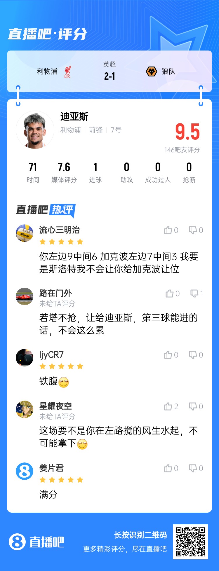 02月16日訊 英超第25輪,利物浦主場2-1戰(zhàn)勝狼隊(duì)。本場比賽迪亞斯回歸左邊路,首發(fā)出戰(zhàn)71分鐘,又貢獻(xiàn)一場精彩表演,打入1球并造點(diǎn)。