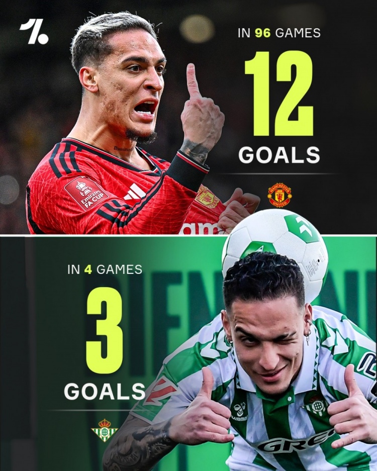 據(jù)OneFootball統(tǒng)計(jì),安東尼在曼聯(lián)出戰(zhàn)96場(chǎng)打進(jìn)12球,加盟貝蒂斯以來出戰(zhàn)4場(chǎng)比賽攻入3球,進(jìn)球效率顯著提高。