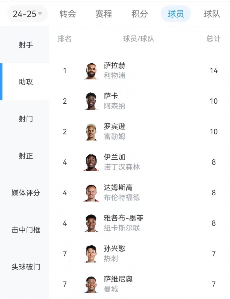 本賽季英超助攻榜: