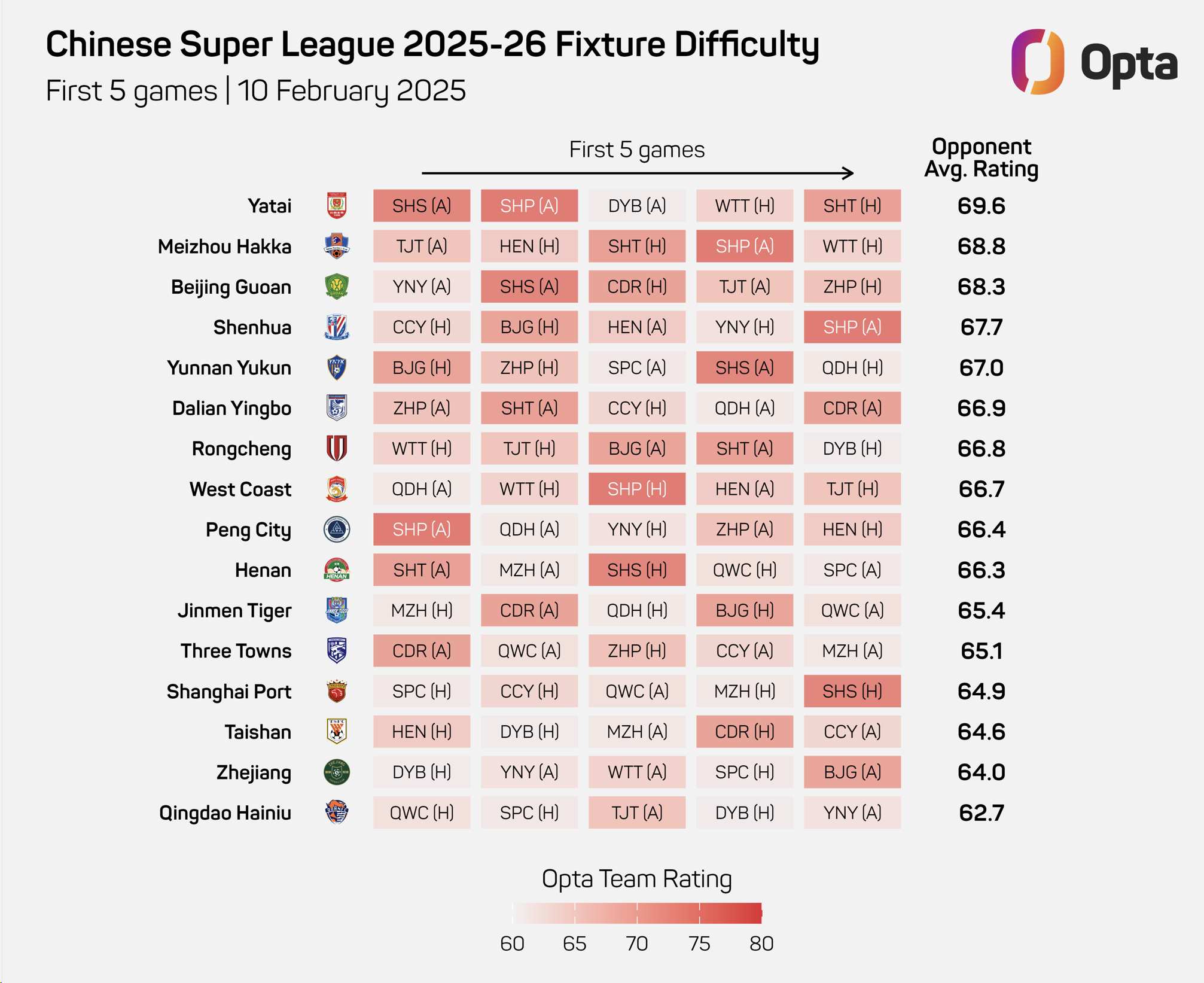 69.6 v 62.7- 根據(jù)Opta大數(shù)據(jù)模型,2025賽季中超聯(lián)賽前5輪比賽賽程