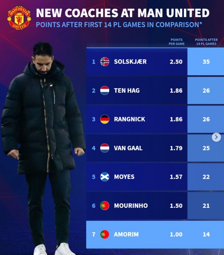 2月18日訊 曼聯(lián)在換帥后成績持續(xù)下滑,《轉會市場》統(tǒng)計顯示阿莫林是同期成績最差的主教練。