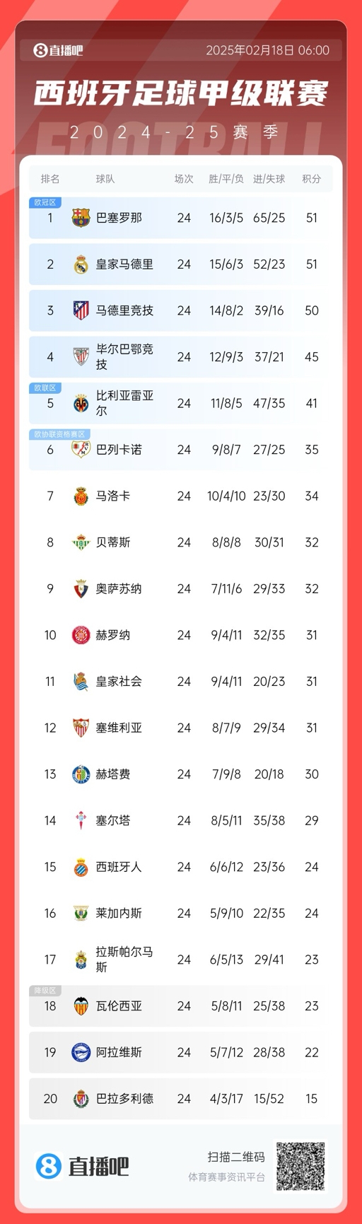 2月18日訊 西甲第24輪,巴塞羅那1-0小勝巴列卡諾,重回西甲榜首,憑借凈勝球優(yōu)勢力壓皇馬。