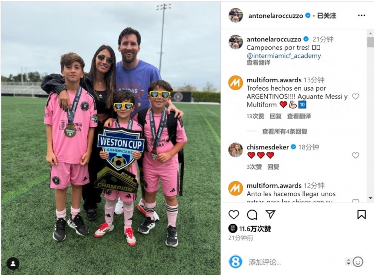 梅西的三個(gè)兒子隨邁阿密國(guó)際青訓(xùn)梯隊(duì)參加韋斯頓杯比賽,安東內(nèi)拉社媒曬出一家人的合照,蒂亞戈、馬特奧、西羅均佩戴冠軍獎(jiǎng)牌,配文:“三個(gè)冠軍!”