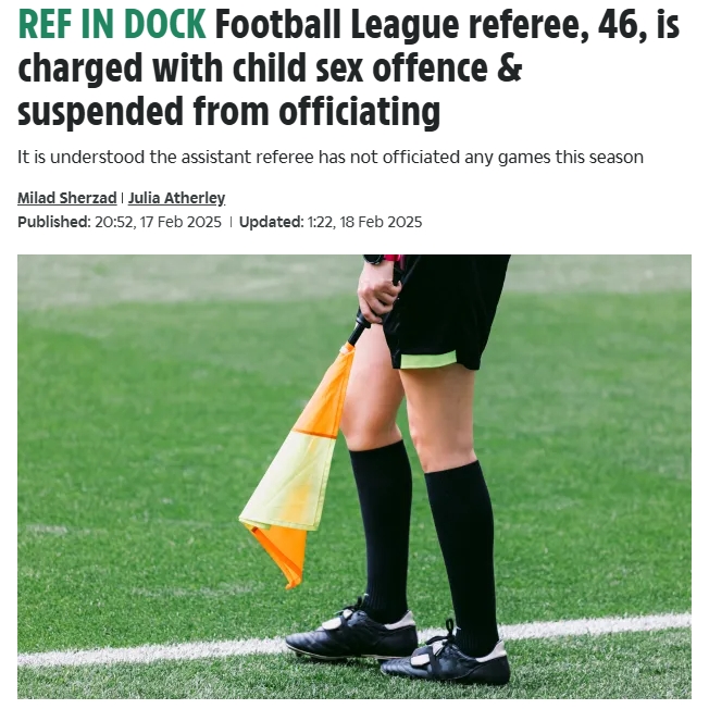 2月18日訊 《太陽報(bào)》報(bào)道,一位曾擔(dān)任英格蘭足球聯(lián)賽(EFL,負(fù)責(zé)英冠、英甲、英乙)和足總杯比賽助理裁判的男子將因涉嫌兒童性犯罪出庭受審。
