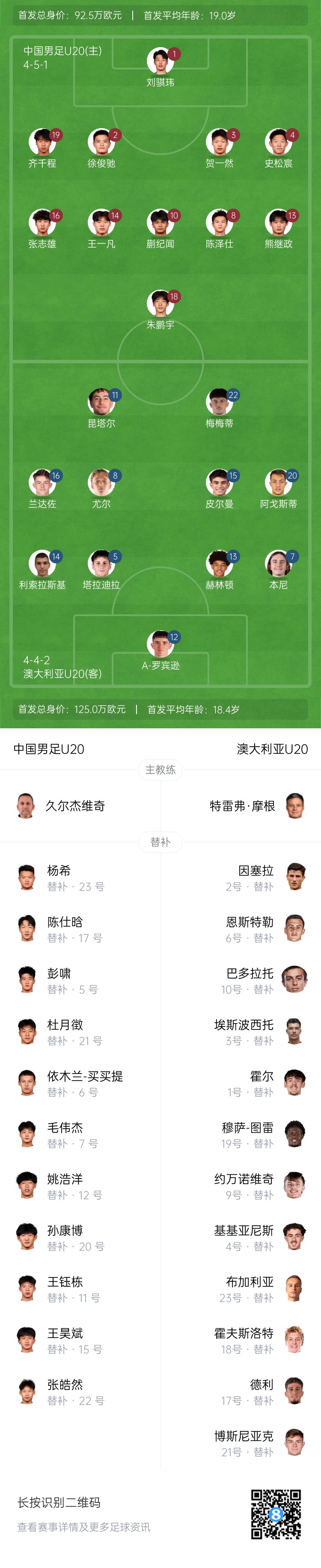 2月18日訊 北京時(shí)間19點(diǎn)30分,U20亞洲杯小組賽A組第三輪,中國vs澳大利亞,賽前雙方首發(fā)公布!本場比賽劉誠宇因累積黃牌停賽,較上場比賽國青首發(fā)更換6人,澳大利亞則更換了9人。