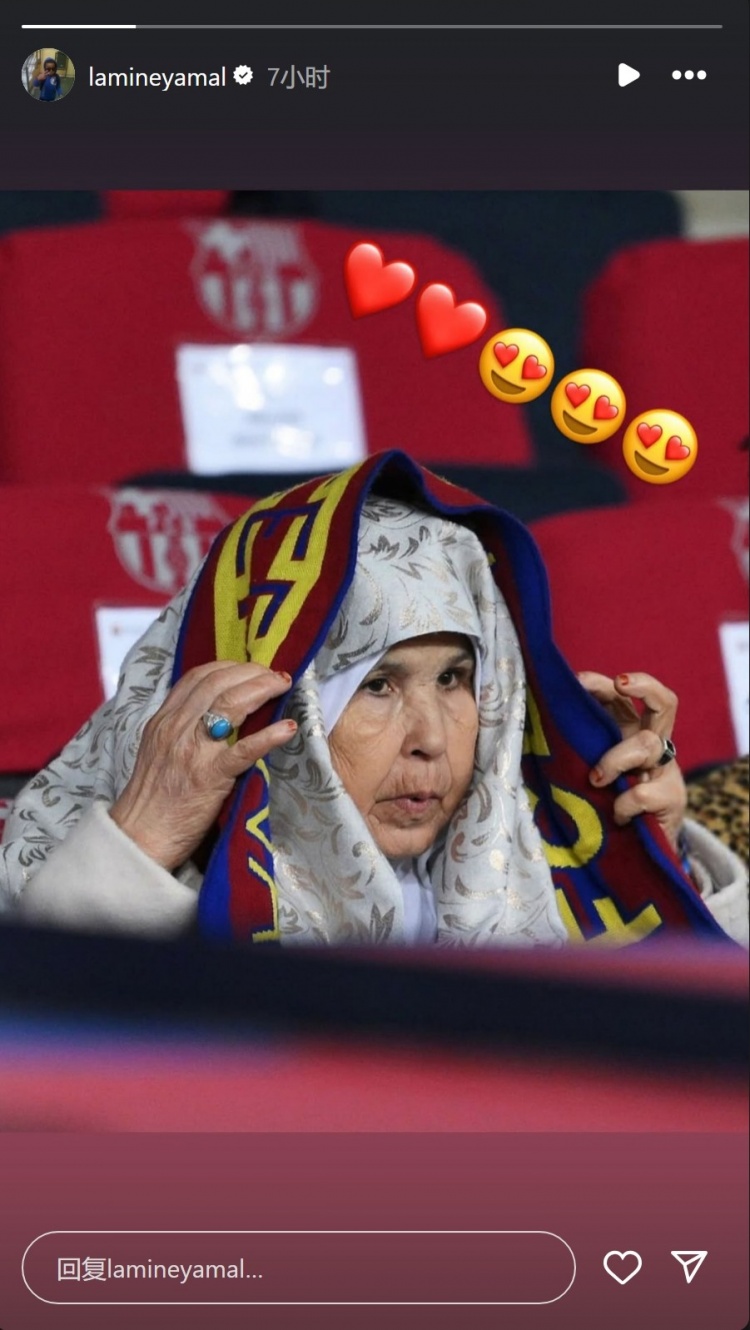 亞馬爾的祖母來(lái)到現(xiàn)場(chǎng)觀看比賽,亞馬爾在社交媒體上曬出祖母的照片,并配上了紅心表情符號(hào)。