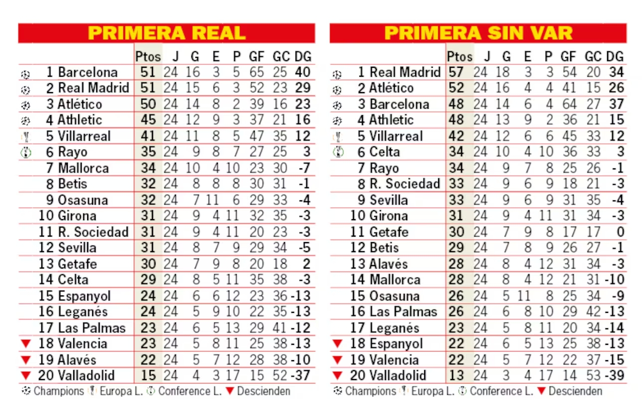 西媒《阿斯報(bào)》撰文提到,本賽季視頻助理裁判導(dǎo)致了積分榜形勢(shì)逆轉(zhuǎn),如果沒(méi)有VAR,皇馬則會(huì)以5分優(yōu)勢(shì)領(lǐng)跑積分榜,而巴薩會(huì)降至積分榜第三名,馬競(jìng)排在第二位。