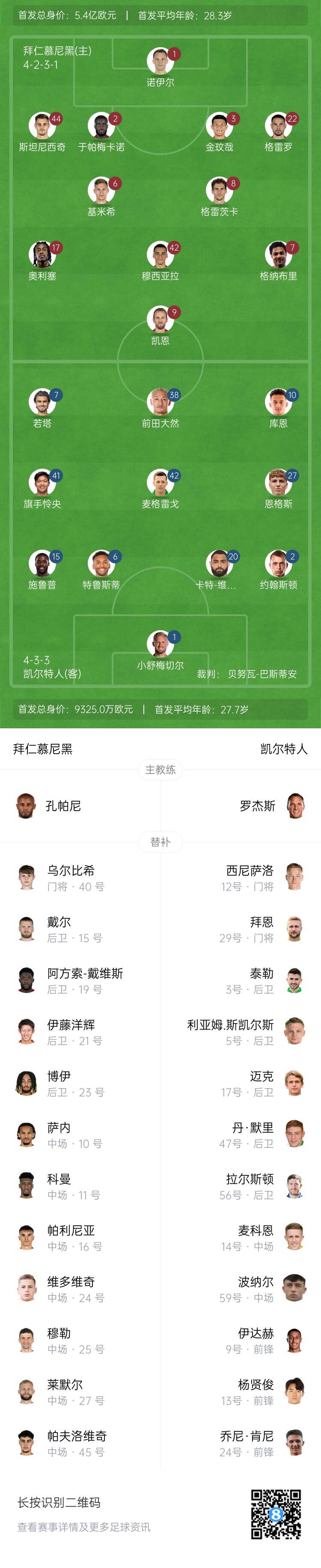 拜仁替補(bǔ):40-烏爾比希、10-薩內(nèi)、11-科曼、15-戴爾、16-帕利尼亞、19-阿方索-戴維斯、21-伊藤洋輝、23-博伊、24-維多維奇、25-托馬斯-穆勒、27-萊默爾、45-帕夫洛維奇