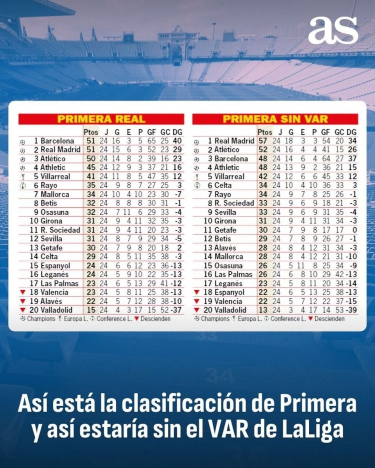2月19日訊 《阿斯報》統(tǒng)計了如果沒有VAR介入的西甲積分榜情況,皇馬將領(lǐng)先巴薩多達(dá)9分。