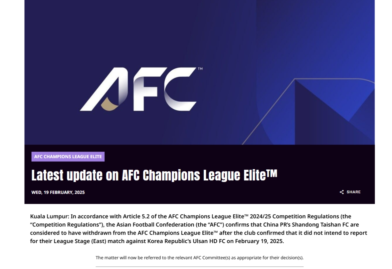 根據(jù)《亞足聯(lián)冠軍聯(lián)賽精英賽2024/25競(jìng)賽規(guī)程》(簡(jiǎn)稱"競(jìng)賽規(guī)程")第5.2條款規(guī)定,亞足聯(lián)確認(rèn)中國(guó)山東泰山足球俱樂(lè)部因明確表示不參加原定于2025年2月19日與韓國(guó)蔚山HD足球俱樂(lè)部進(jìn)行的東亞區(qū)聯(lián)賽階段賽事,現(xiàn)被視為退出本屆亞足聯(lián)冠軍聯(lián)賽精英賽。