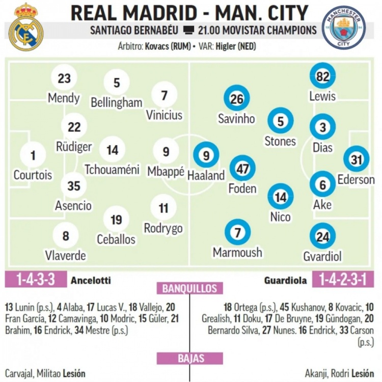 西班牙媒體《馬卡報(bào)》預(yù)測了兩隊(duì)此役的首發(fā)陣容,皇馬中衛(wèi)組合為呂迪格+阿森西奧,巴爾韋德出任右后衛(wèi)。曼城方面馬爾穆什、尼科-岡薩雷斯、劉易斯首發(fā)。