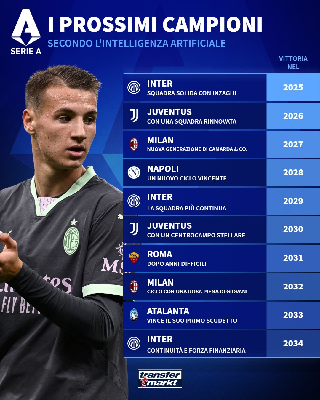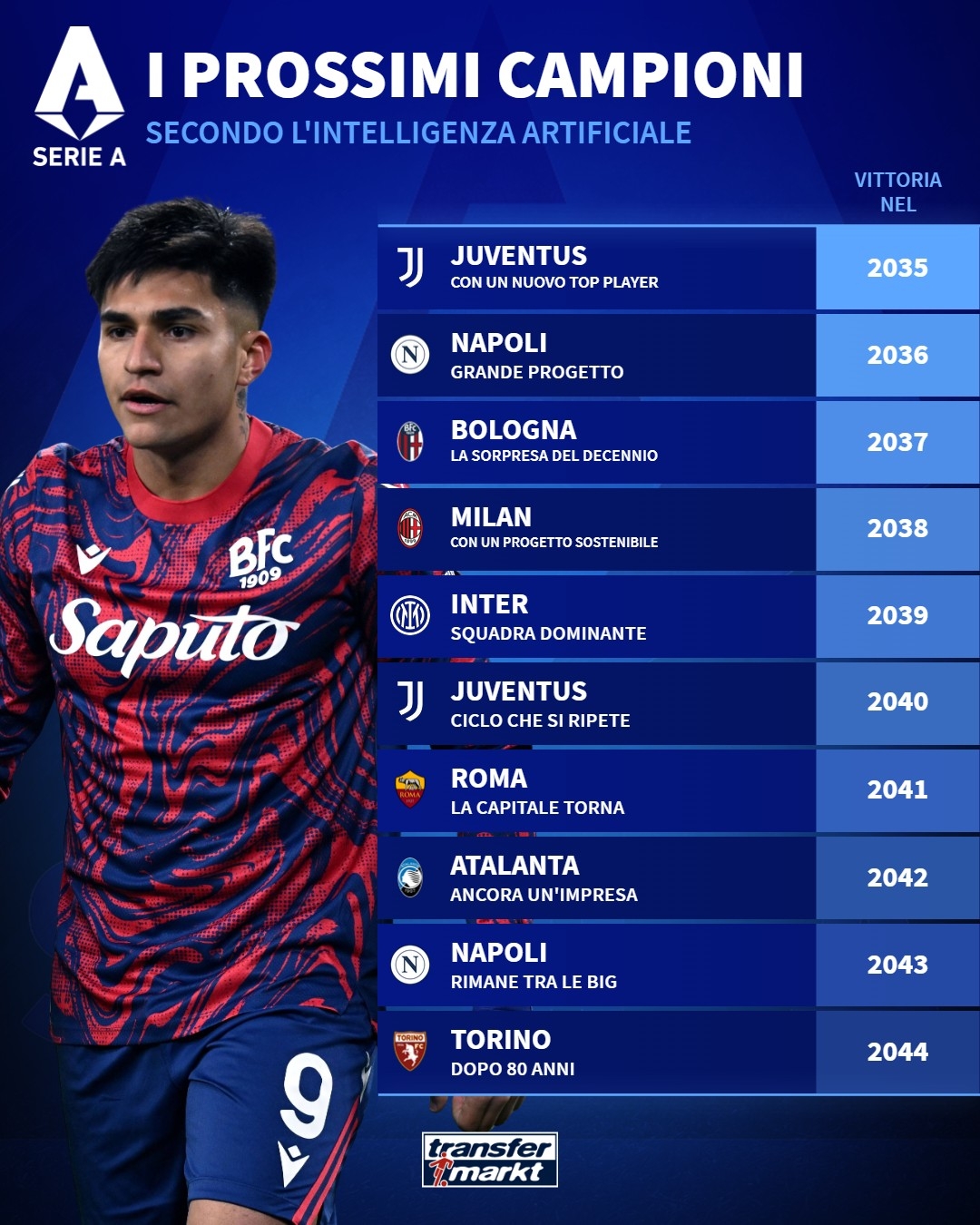 ChatGPT預測未來20年意甲冠軍:國米、尤文:4冠米蘭、那不勒斯:3冠羅馬、亞特蘭大:2冠博洛尼亞、都靈:1冠 標簽: 足球 意甲 AC米蘭 亞特蘭大 國際米蘭 都靈 尤文圖斯 羅馬 那不勒斯 博洛尼亞