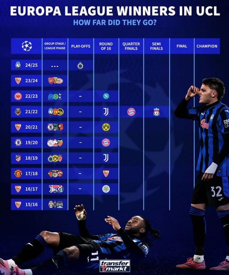 2月20日訊 亞特蘭大在本輪歐冠附加賽被布魯日淘汰出局,表現(xiàn)未能達到預(yù)期?!掇D(zhuǎn)會市場》也列出了近10年歐聯(lián)杯冠軍在第二年參加歐冠的成績。