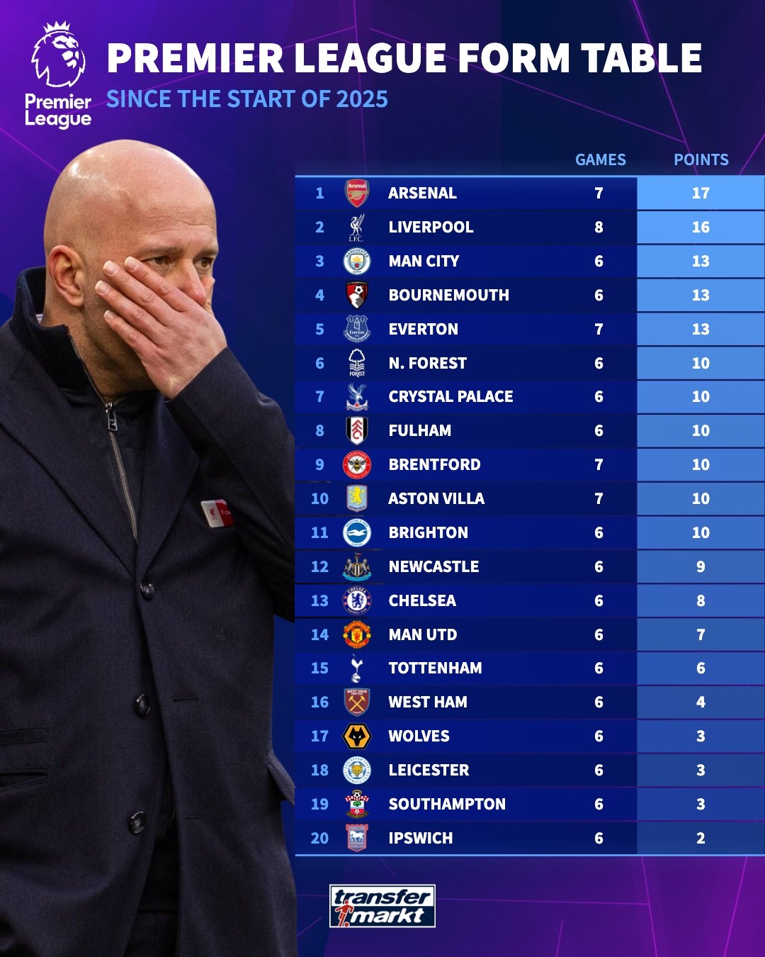 2月20日訊 德國(guó)轉(zhuǎn)會(huì)市場(chǎng)統(tǒng)計(jì)了2025年開(kāi)始至今英超球隊(duì)拿到的積分,并列出榜單,阿森納17分居首,利物浦16分次席。