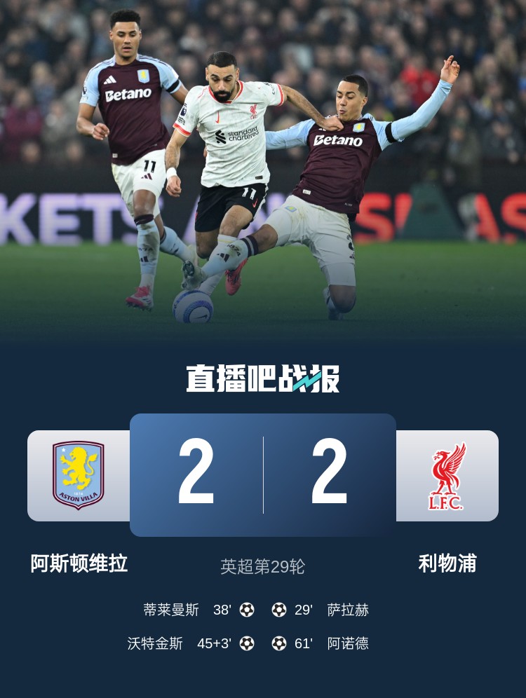 英超第29輪,利物浦2-2戰(zhàn)平維拉。上半場(chǎng),加西亞回傳送禮,若塔搶斷后助攻薩拉赫破門,蒂萊曼斯扳平,沃特金斯頭球助維拉反超;下半場(chǎng),薩拉赫助攻阿諾德進(jìn)球,利物浦扳平比分,努涅斯屢次錯(cuò)失良機(jī)。