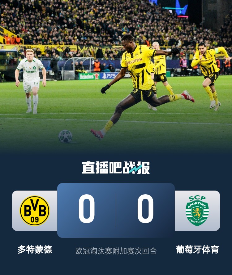 歐冠淘汰賽附加賽次回合,多特0-0葡萄牙體育,總比分3-0晉級(jí)16強(qiáng)。上半場(chǎng),多特占據(jù)場(chǎng)上主動(dòng)多次威脅球門,可惜未能把握住進(jìn)球機(jī)會(huì);下半場(chǎng),阿德耶米造點(diǎn),吉拉西主罰點(diǎn)球被撲,雷納單刀中柱,埃姆雷-詹進(jìn)球被吹。