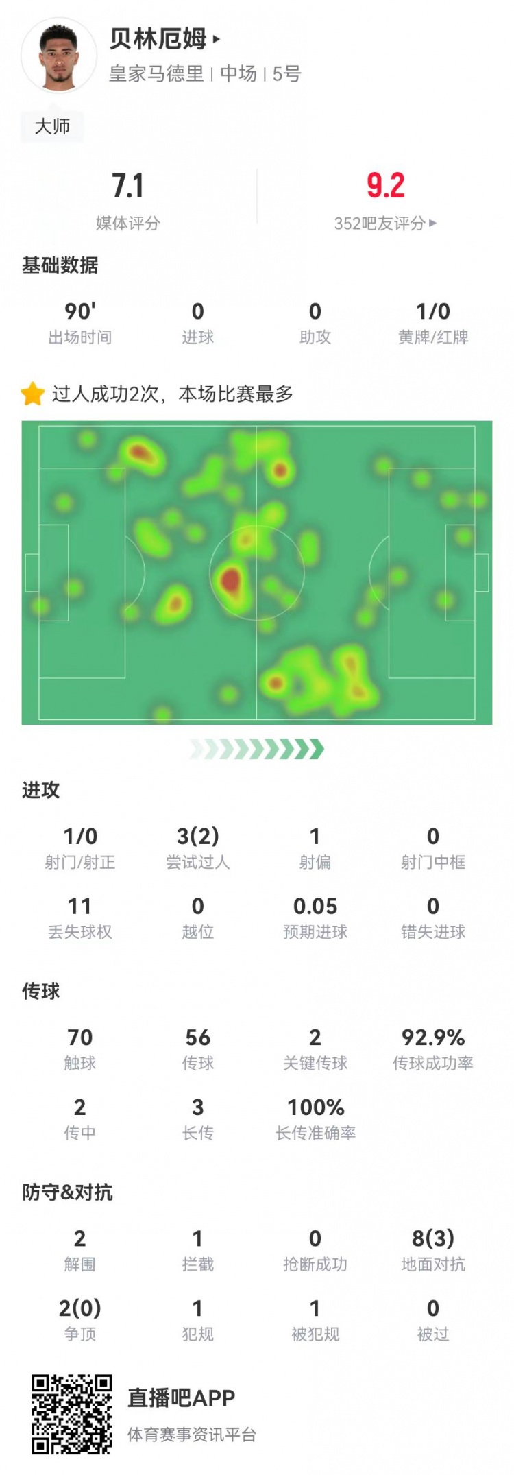 2月20日訊 皇馬在本輪歐冠次回合3-1擊敗曼城,貝林厄姆本場數(shù)據(jù)如下: