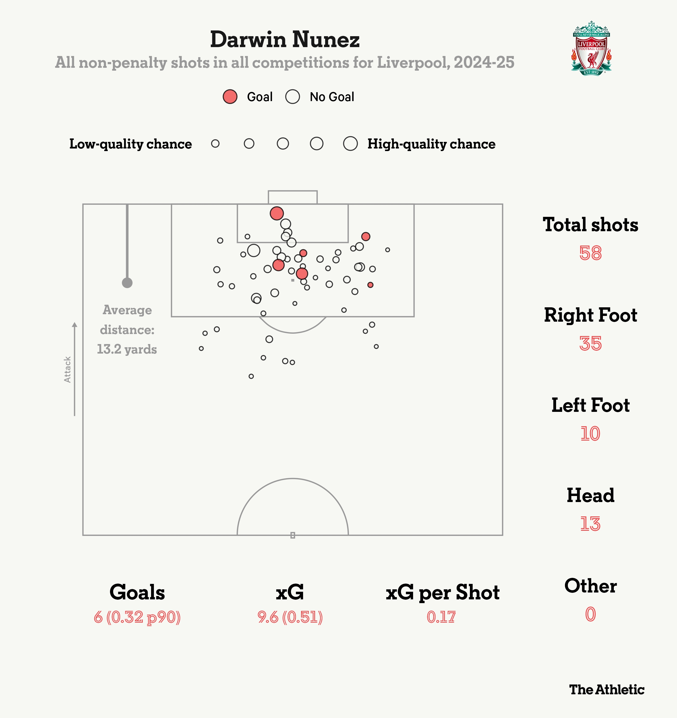 小禁區(qū)附近扎堆丟!努涅斯射門分布:預(yù)期進(jìn)球9.6球 實(shí)際只進(jìn)6球