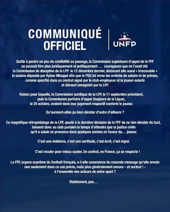 法國職業(yè)球員工會發(fā)表官方公告,嚴(yán)厲批評法國足協(xié)上訴委員會延續(xù)法國職業(yè)聯(lián)盟紀(jì)律委員會去年的決定,前者對姆巴佩和巴黎的薪資糾紛案“不予受理”。