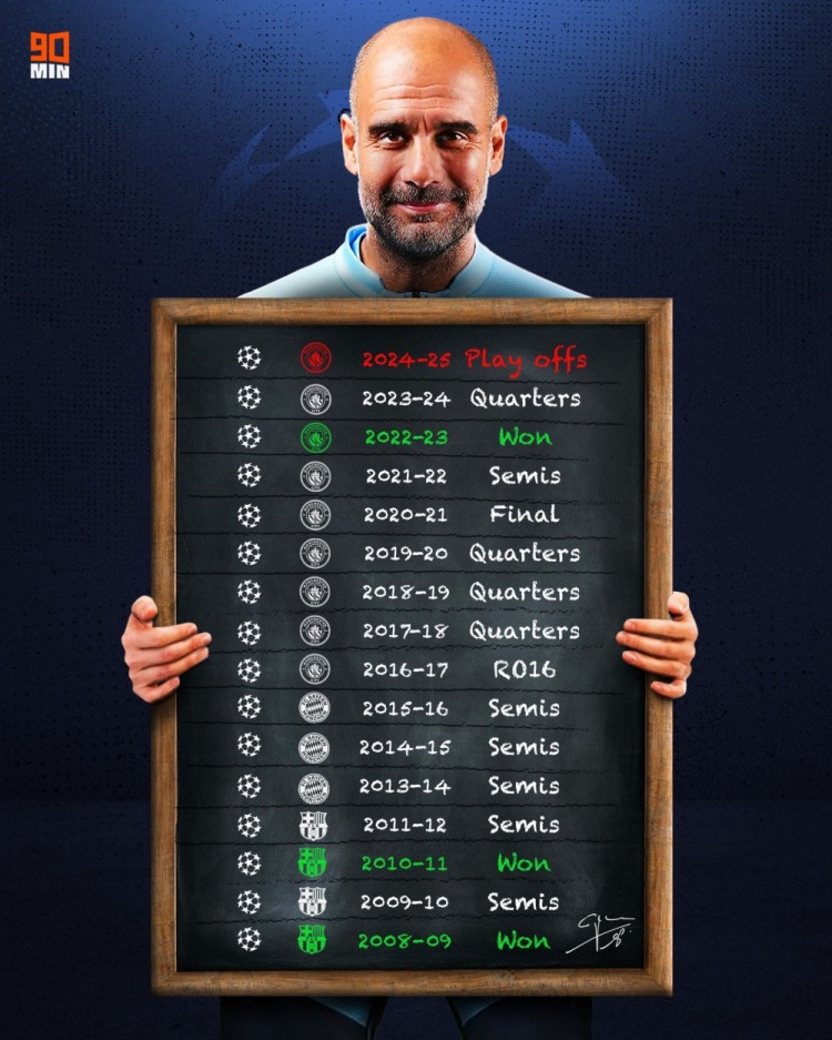 90min Football統(tǒng)計(jì)了瓜迪奧拉執(zhí)教生涯至今的歐冠成績,他帶隊(duì)獲得3次冠軍、1次亞軍,6次止步4強(qiáng),本賽季是首次未進(jìn)入16強(qiáng)。