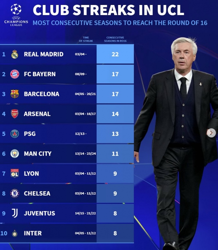 2月21日訊 皇馬在本輪歐冠附加賽雙殺曼城,成功挺進(jìn)歐冠十六強(qiáng)?!掇D(zhuǎn)會市場》也統(tǒng)計了歐冠歷史最長連續(xù)晉級十六強(qiáng)榜單。