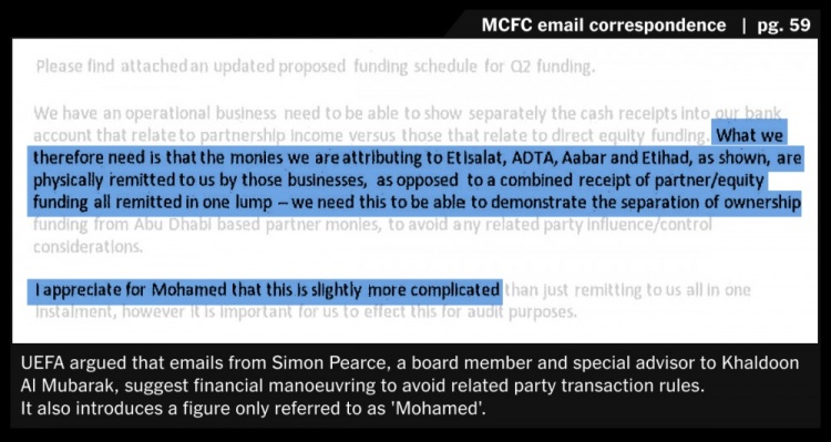 歐足聯(lián)表示,西蒙-皮爾斯的郵件中表明,為規(guī)避關(guān)聯(lián)交易規(guī)則,進(jìn)行了一些財(cái)務(wù)操作。西蒙-皮爾斯是曼城董事會(huì)成員,也是穆巴拉克的特別顧問。郵件中還引入了一個(gè)叫做“穆罕默德”的代稱。