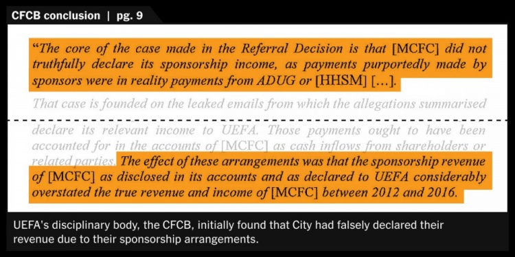 最初,歐足聯(lián)裁決庭認(rèn)定曼城違規(guī),該裁決庭表示,曼城“沒有如實(shí)申報(bào)他們的贊助收入,因?yàn)閾?jù)稱有贊助商支付的款項(xiàng),實(shí)際上是來自阿布扎比或者曼蘇爾”。
