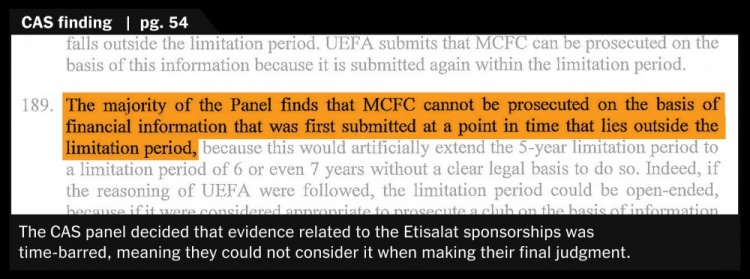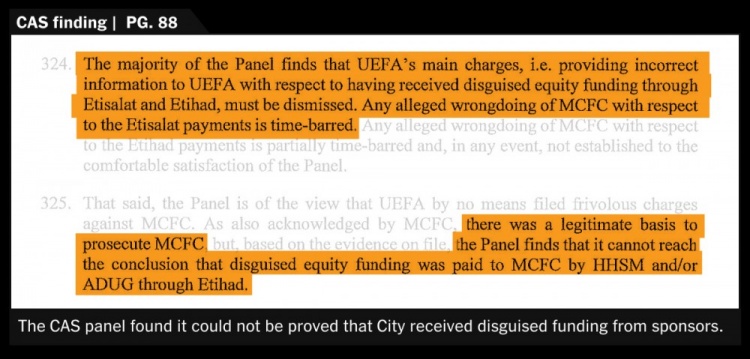 CAS三人小組中的兩人駁回了曼城通過伊蒂哈德航空和阿聯(lián)酋電信收到變相付款(或者說是“假贊助”)的主要指控,認(rèn)為所有與阿聯(lián)酋航空付款有關(guān)的“證據(jù)”都已經(jīng)超過時(shí)效,伊蒂哈德航空的付款也是如此。并且無論如何,提供錯(cuò)誤信息的指控尚未成立。
