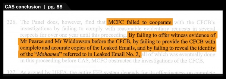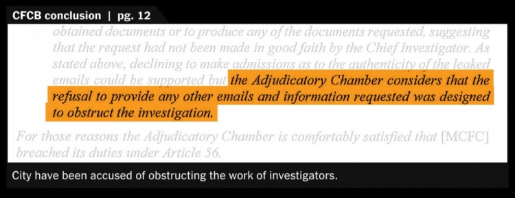 CAS判決中顯示,曼城未能提供相應(yīng)的證據(jù),確實(shí)阻礙了CFCB的調(diào)查。