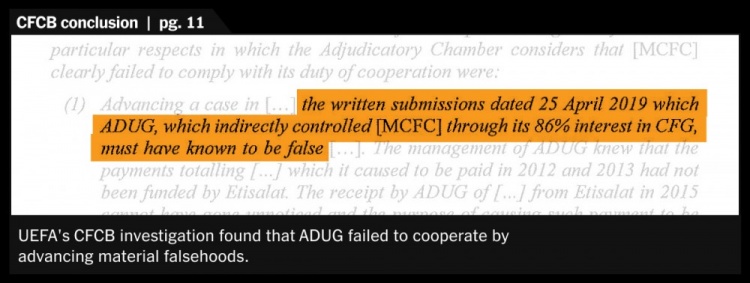 CFCB調(diào)查發(fā)現(xiàn),曼蘇爾通過其在城市集團(tuán)的股份間接控制了曼城,且未能配合調(diào)查,解釋CFCB所懷疑的“虛假信息”。