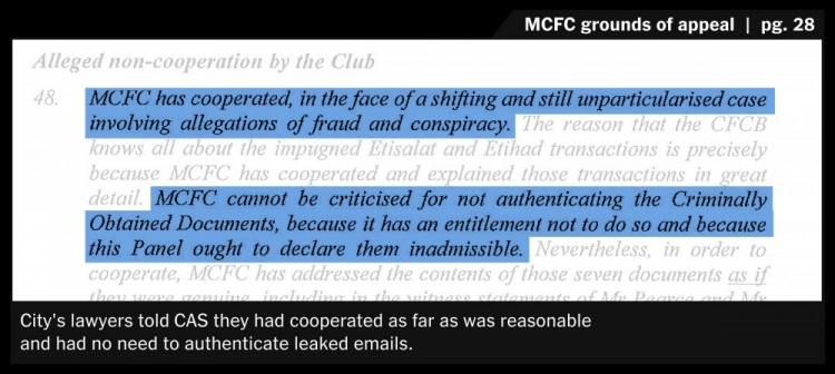 曼城向CAS提出了上訴,聲稱他們不必對(duì)泄露的郵件進(jìn)行身份驗(yàn)證,并認(rèn)為它們超出了審查小組的需要。