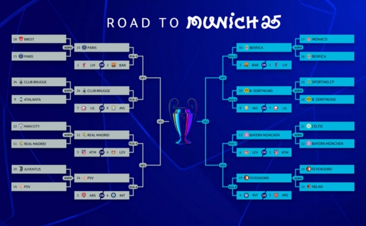 2024/25賽季歐冠16強淘汰賽對陣抽簽將于北京時間今天晚上19:00進行,抽簽地點位于瑞士尼翁。