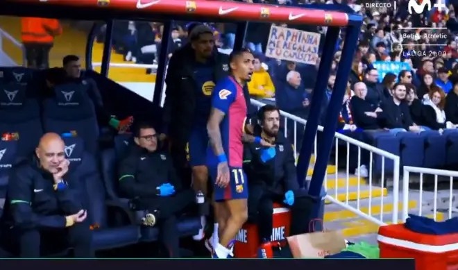 2月3日訊 本輪西甲,巴薩1-0小勝阿拉維斯,Movistar鏡頭拍到,拉菲尼亞在下場時對裁判的判罰表達了不滿。