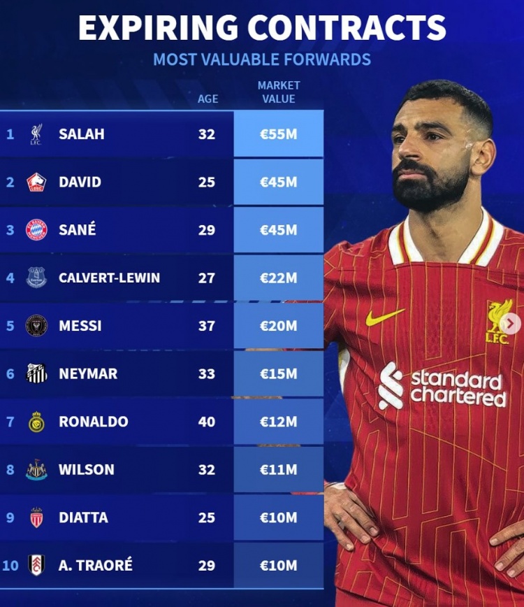 2月21日訊 《轉會市場》統(tǒng)計了合同將在今年到期的前鋒身價榜,薩拉赫身價最高。