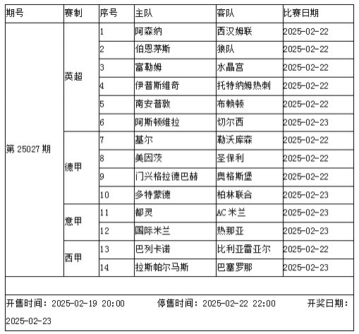 傳足勝負(fù)彩第25027期競猜賽事中不乏豪門出戰(zhàn):英超方面,阿森納主場對陣西漢姆,切爾西客場挑戰(zhàn)維拉;意甲,國際米蘭主場迎來熱那亞;西甲賽場上,巴薩客場面對拉斯帕爾馬斯。