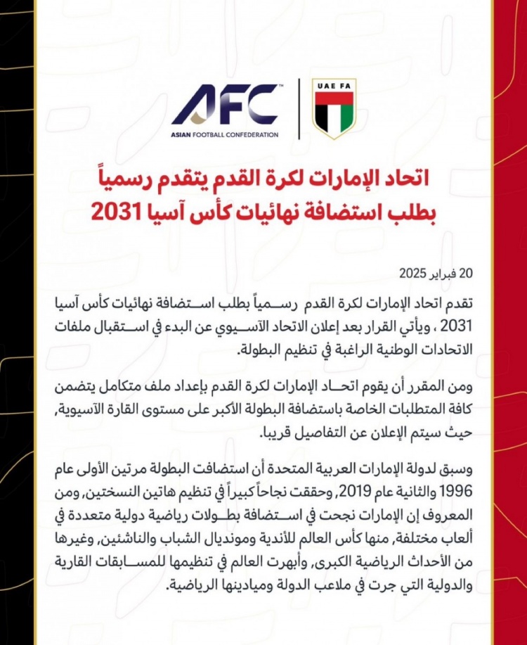 2月21日訊 阿聯(lián)酋足協(xié)官方宣布,已經(jīng)正式提交了申辦2031年亞洲杯的申請。此前,印尼、韓國、科威特已經(jīng)表態(tài)將申辦該屆賽事。