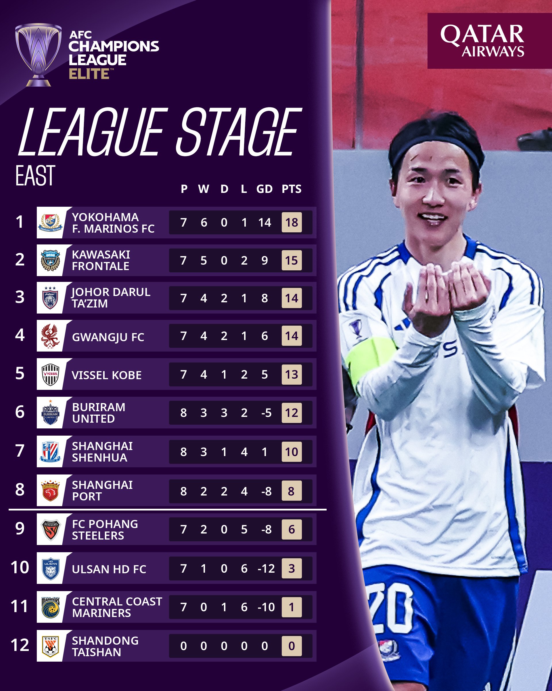 亞冠官推公布積分榜:山東泰山戰(zhàn)績清零,海港申花晉級
