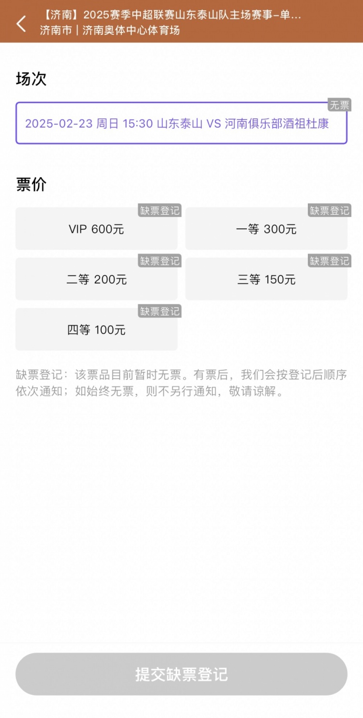 2月22日訊 2月23日下午,中超聯(lián)賽首輪山東泰山將在主場對陣河南隊。據(jù)購票平臺顯示,本場比賽球票已售罄。