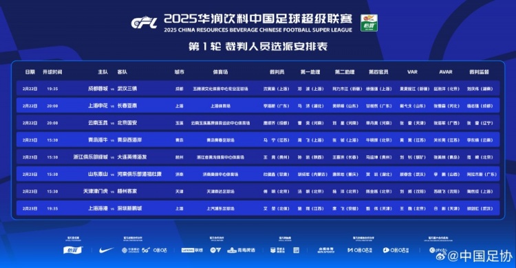 2月22日訊 中國足協(xié)公布了新賽季中超首輪裁判人員選派名單,馬寧將執(zhí)法海牛與西海岸的青島德比。