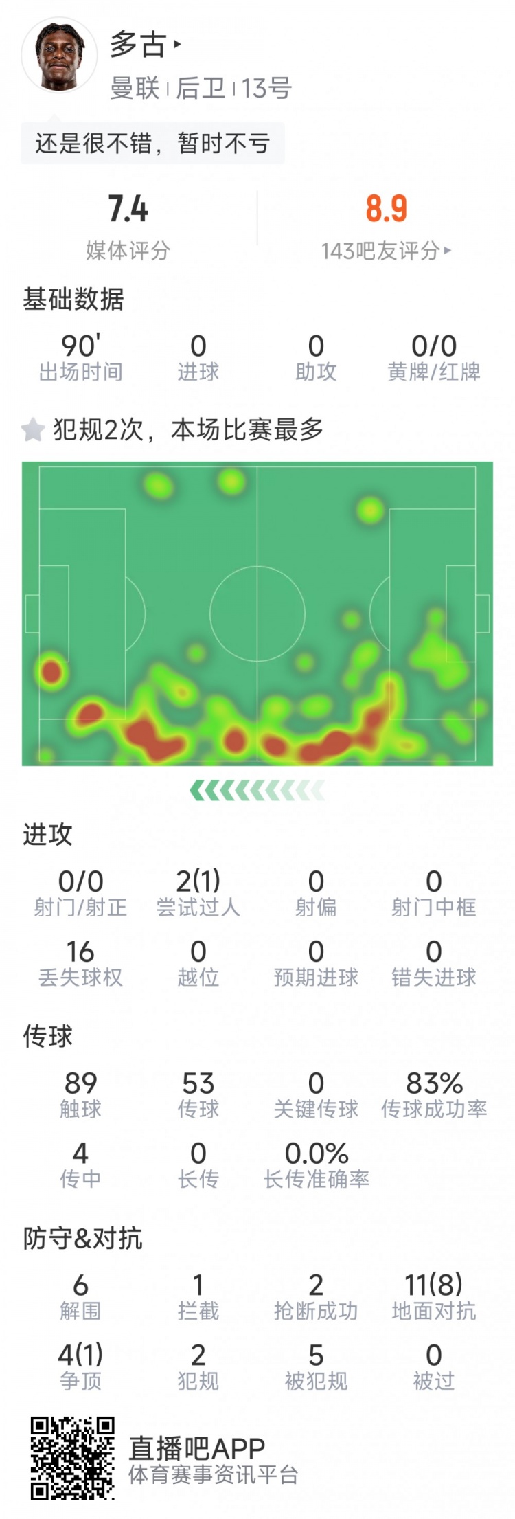 可圈可點,多古本場數(shù)據(jù):6次解圍,9次成功對抗,2次搶斷